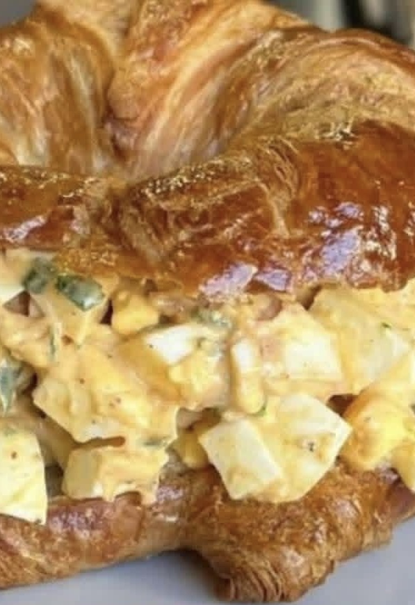 This sandwich features a creamy, slightly tangy egg salad nestled inside a buttery croissant. The contrast between soft filling and flaky pastry creates a luxurious texture. Each bite delivers richness from the eggs and mayo, brightness from lemon, and freshness from herbs.