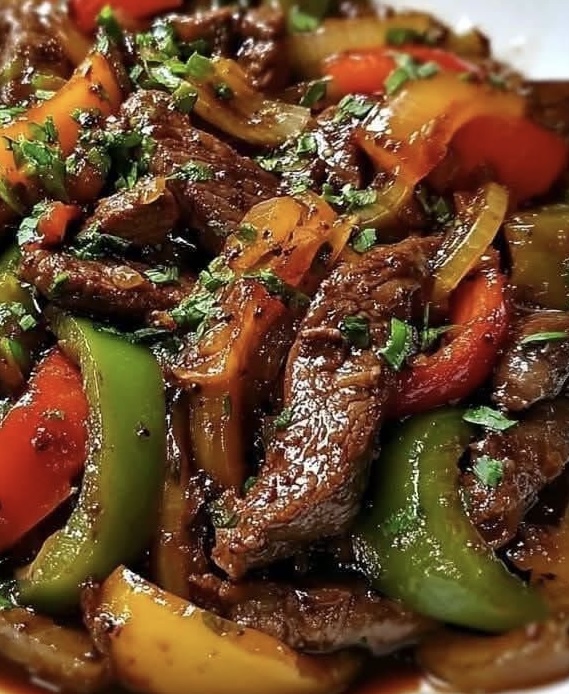 This dish features juicy strips of beef coated in a glossy, savory sauce, paired with slightly sweet onions and crunchy peppers. The contrast of textures and the rich umami flavor make it both comforting and exciting.