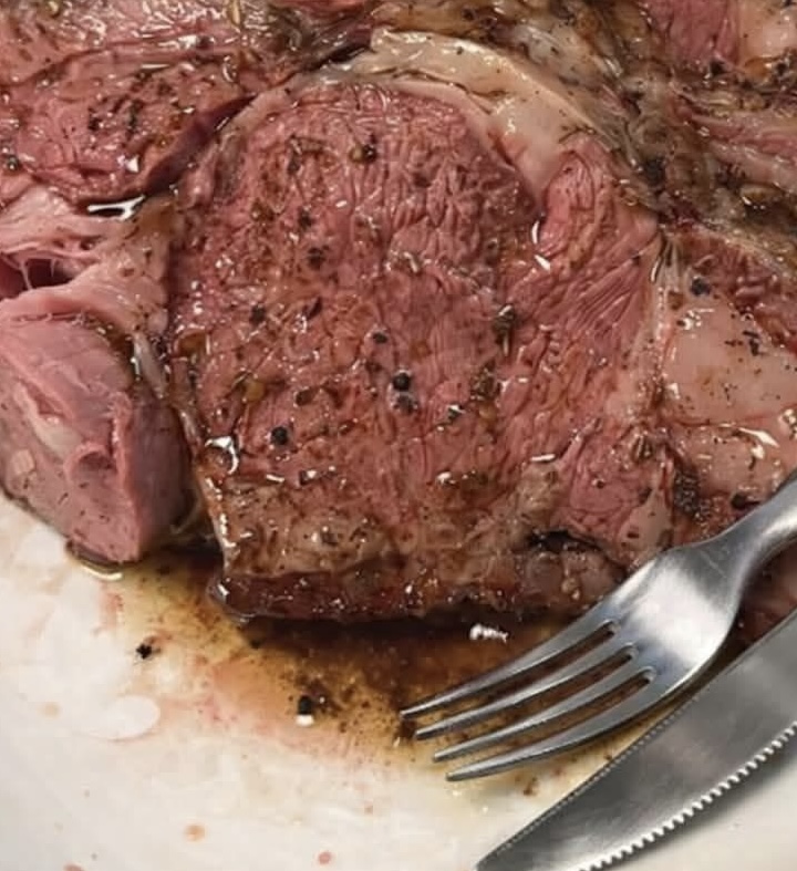 The finished prime rib roast features a beautifully browned crust infused with herbs and garlic, while the inside remains tender, juicy, and full of natural beef flavor. Each slice is succulent, with a perfect balance of texture and richness.