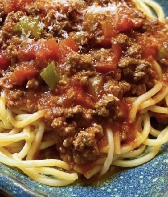This old-fashioned spaghetti features a rich, savory tomato sauce with tender meat and aromatic herbs. The texture is hearty yet balanced, with the pasta perfectly coated in a flavorful, slightly tangy sauce.