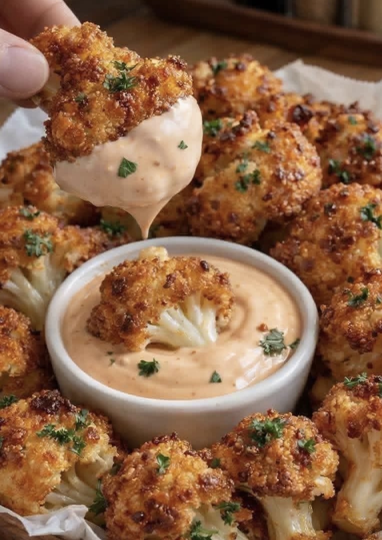 Air-fried crispy cauliflower is golden on the outside, tender on the inside, and packed with savory seasoning. It offers the crunch of fried food with a lighter, less oily finish, making it suitable as a snack, appetizer, or side dish.