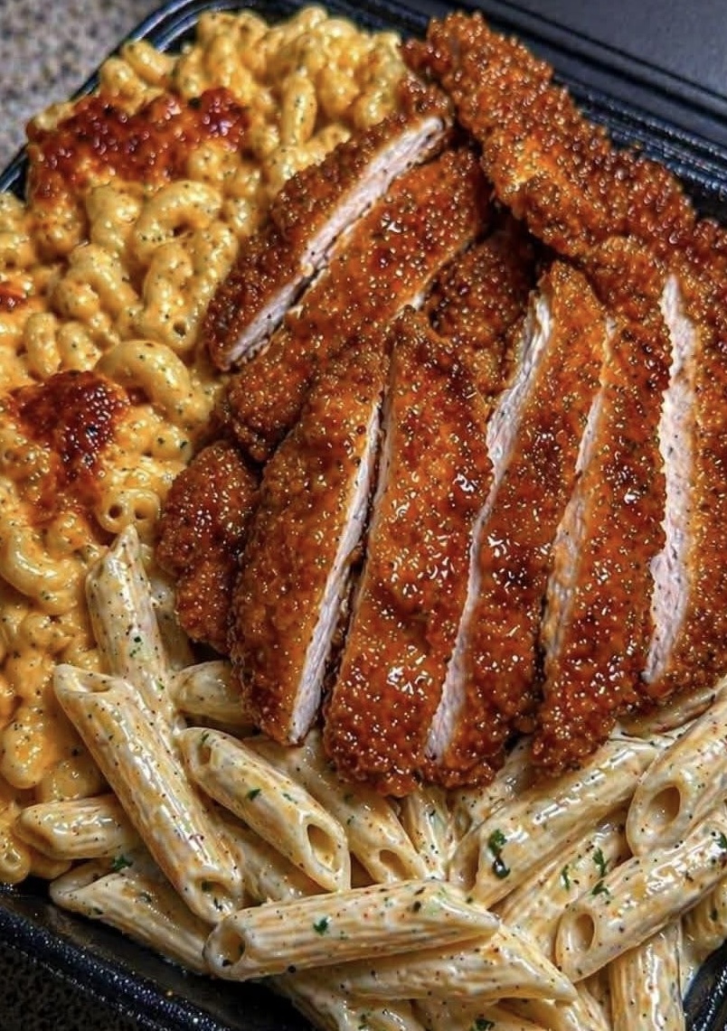 Meals like this represent contemporary food culture—blending culinary traditions to create something universally appealing. Fried chicken is a staple across many cultures, while pasta symbolizes warmth and family dining. Together, they form a dish that feels both familiar and indulgent.