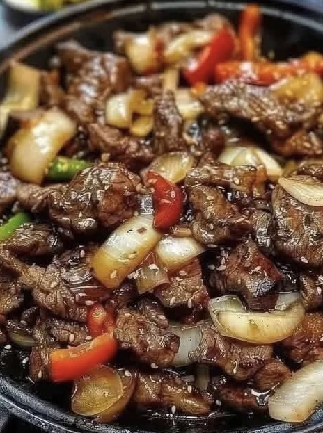 This dish features juicy strips of beef coated in a glossy, peppery sauce, paired with sweet onions and vibrant bell peppers. The flavors are bold yet balanced, with a satisfying contrast between tender meat and crisp vegetables.