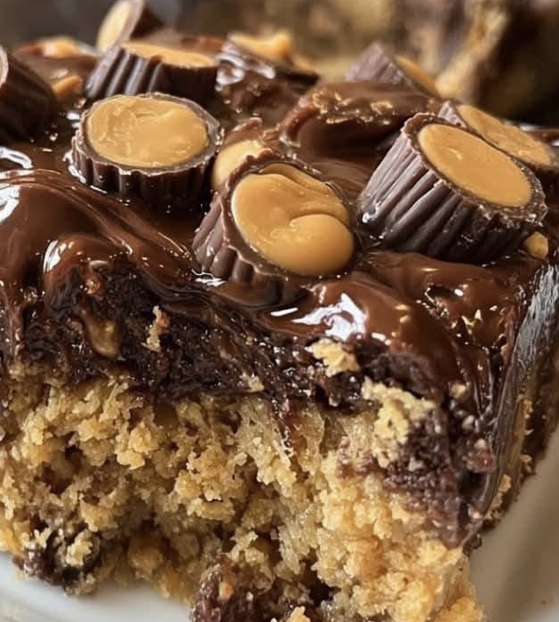 This dessert has a soft, fudgy base with pockets of melted peanut butter and gooey chocolate throughout. The top forms a slightly crisp layer, creating a contrast of textures in every bite.